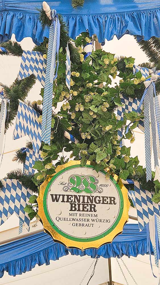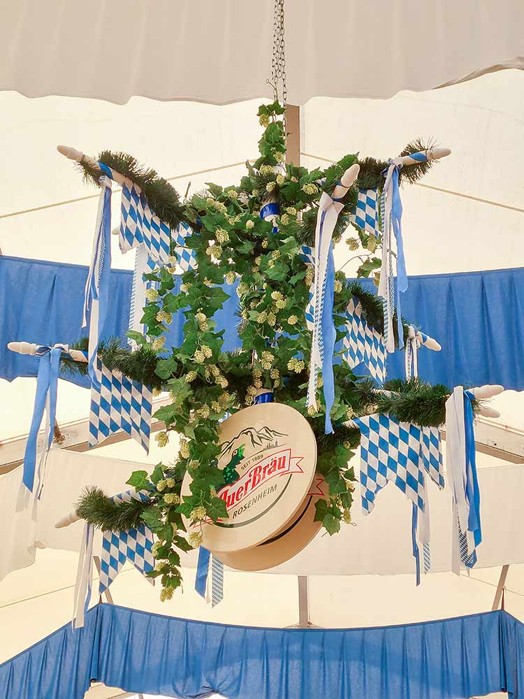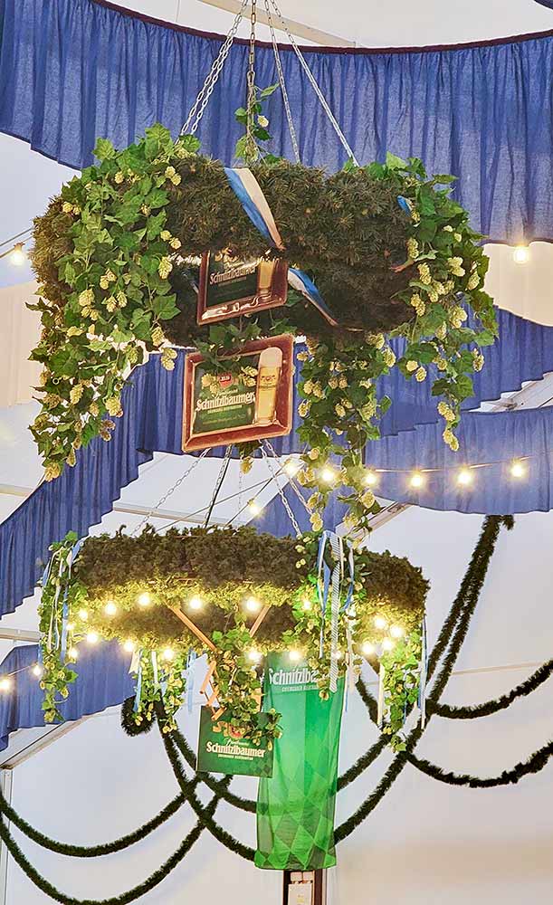 Typische Elemente wie weiß-blaue Rauten, Bänder, Hopfengirlanden, Fahnen und Tannenkränze bilden die Grundlage unserer Arbeit. Diese werden durch Beleuchtung, individuelle Dekoelemente und brauereispezifisches Werbematerial ergänzt.